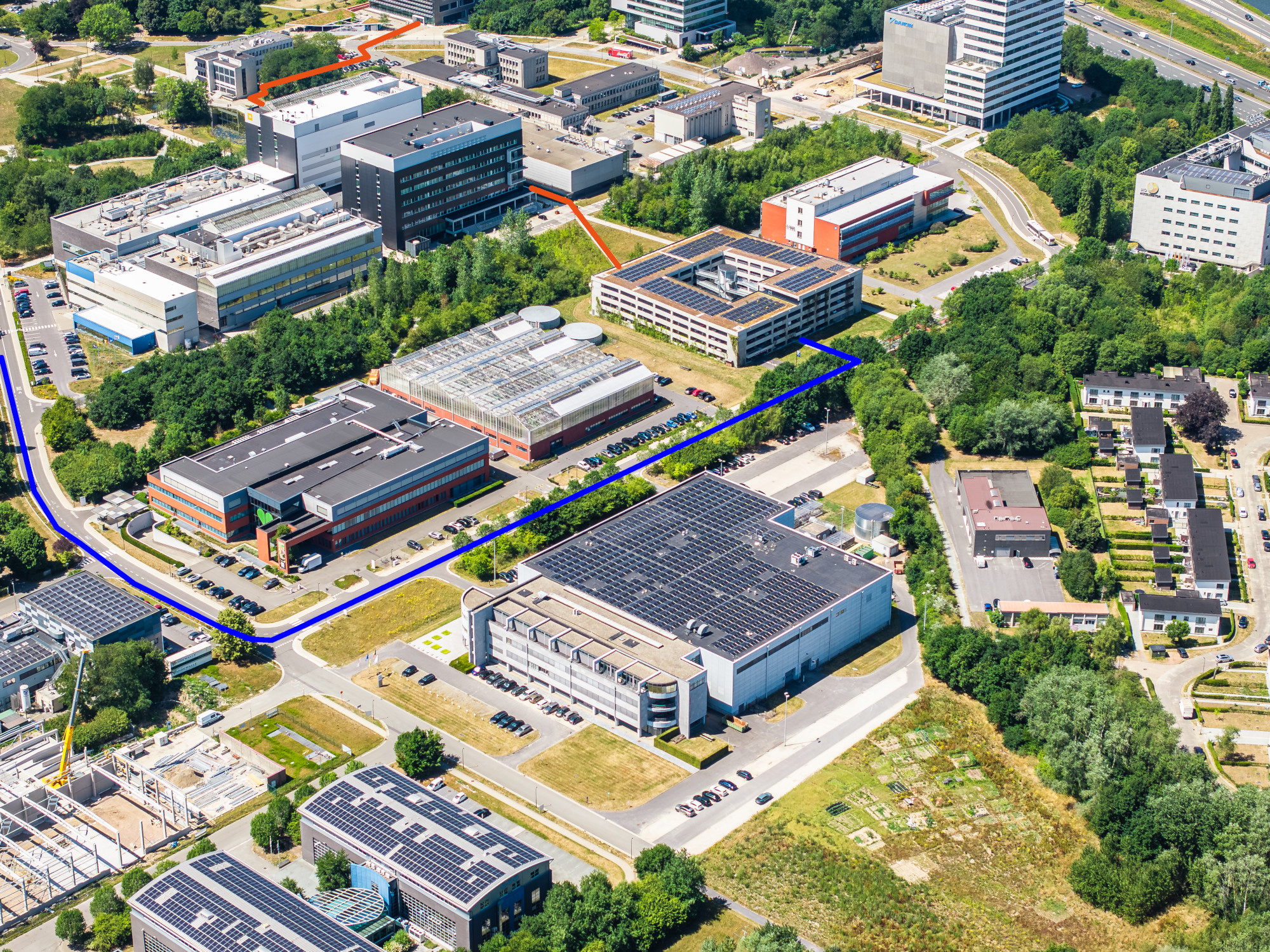 At the main entrance of the campus (label A on the map), watch the traffic lights. Pass the access control barriers, go straight on at the roundabout.