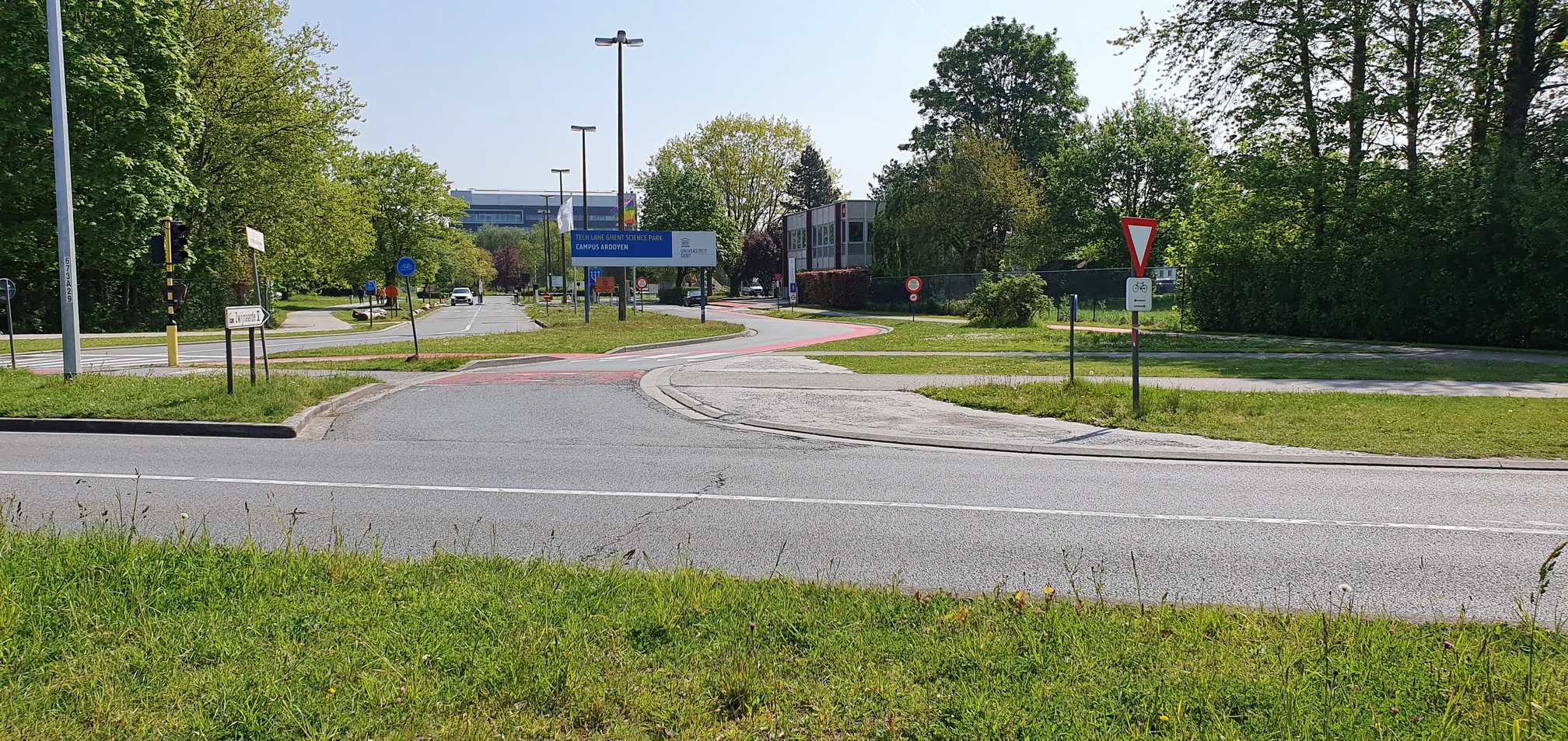 Coming from the exit of the E17, after about 4 km in the direction of "Gent N60" you will encounter a large roundabout with an oblong (oval) shape. The roundabout starts just after the 4th traffic lights. Follow the roundabout and after 180 meters take a right turn onto the "Technologiepark". You are now on the campus.