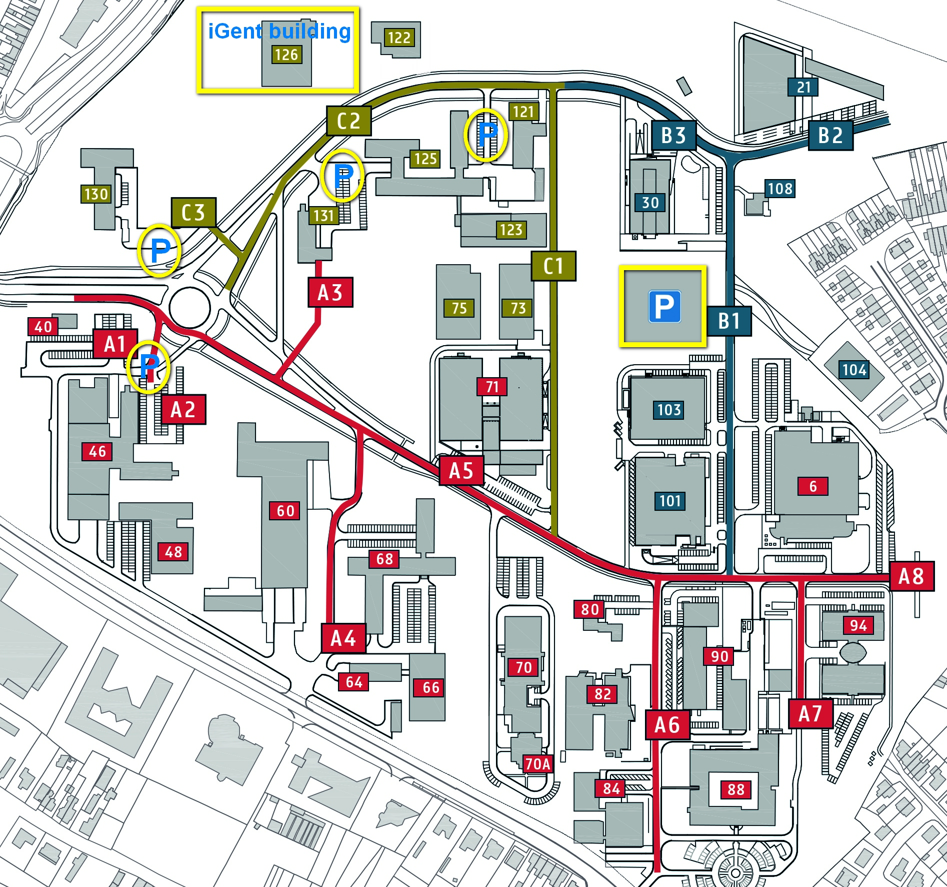The parking on the campus is at Technologiepark-Zwijnaarde105, 9052 Gent (label B on the map)